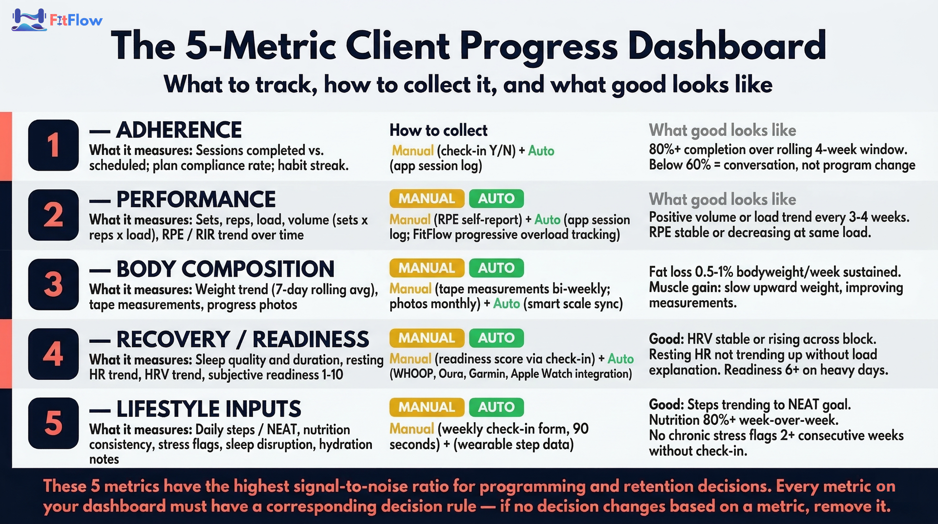 This guide covers the five metrics that research and coaching practice connect to client results, retention, and training readiness. You will get a goal-based dashboard framework that weights those metrics differently for fat-loss, muscle-gain, and general-health clients. You will see exactly what to collect manually versus what to automate. And you will walk away with decision rules -- specific thresholds that tell you when to progress, hold, deload, or refer out.