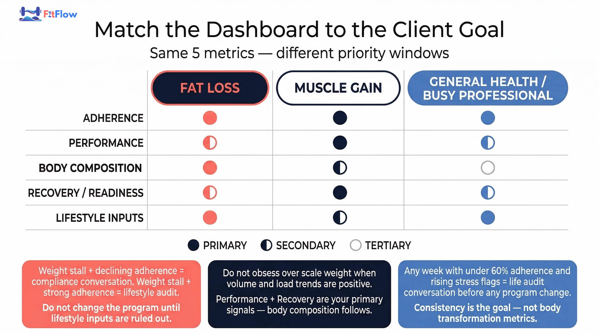 What is the best way to measure fitness progress? The best way depends on the client's primary goal. All five metrics belong on the dashboard, but the priority weighting changes. Fat-loss clients need adherence, body composition, and lifestyle inputs as primary signals. Muscle-gain clients need performance and recovery front and center. General-health clients should focus on adherence and lifestyle consistency above all else.