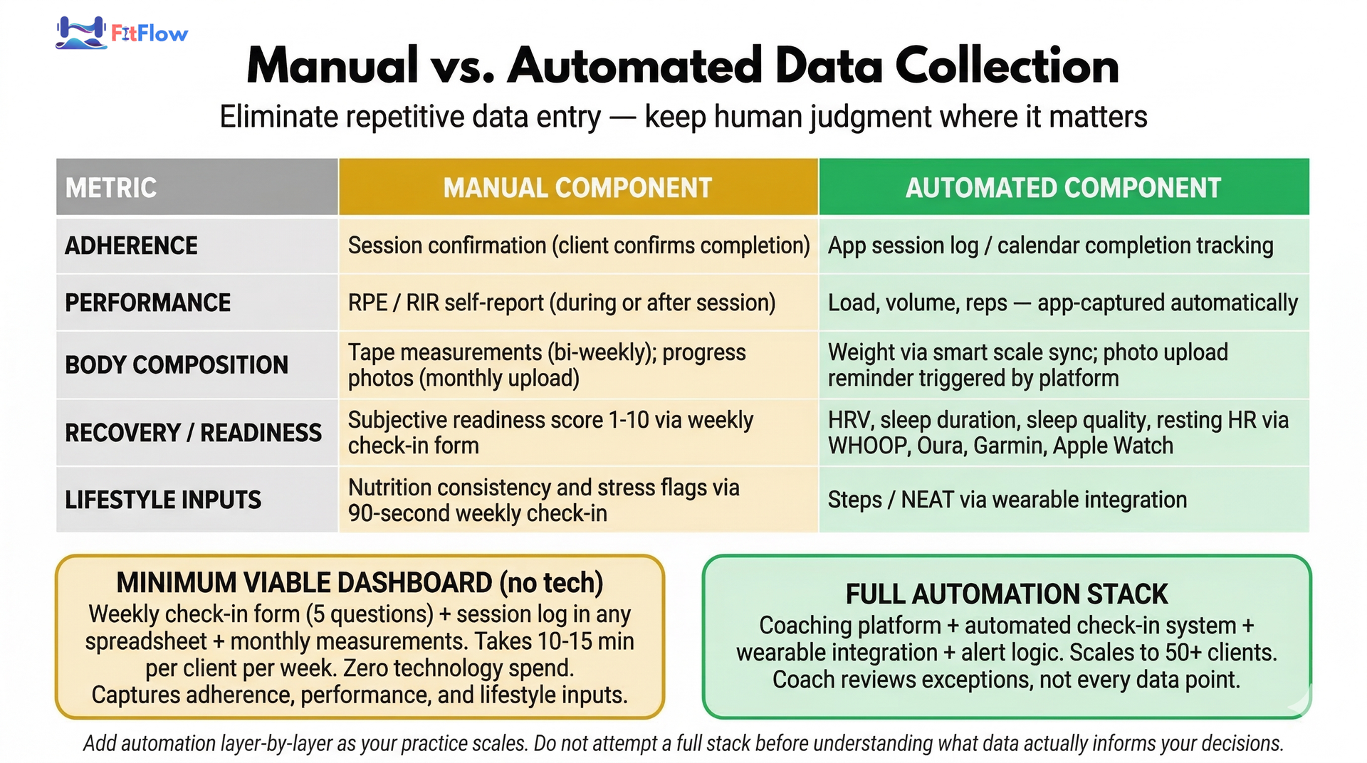 This takes 10-15 minutes per client per week and captures adherence, performance, and lifestyle inputs with zero technology spend. As your practice scales, add automation layer-by-layer. Do not attempt a full automation stack before you understand what data actually shapes your decisions.