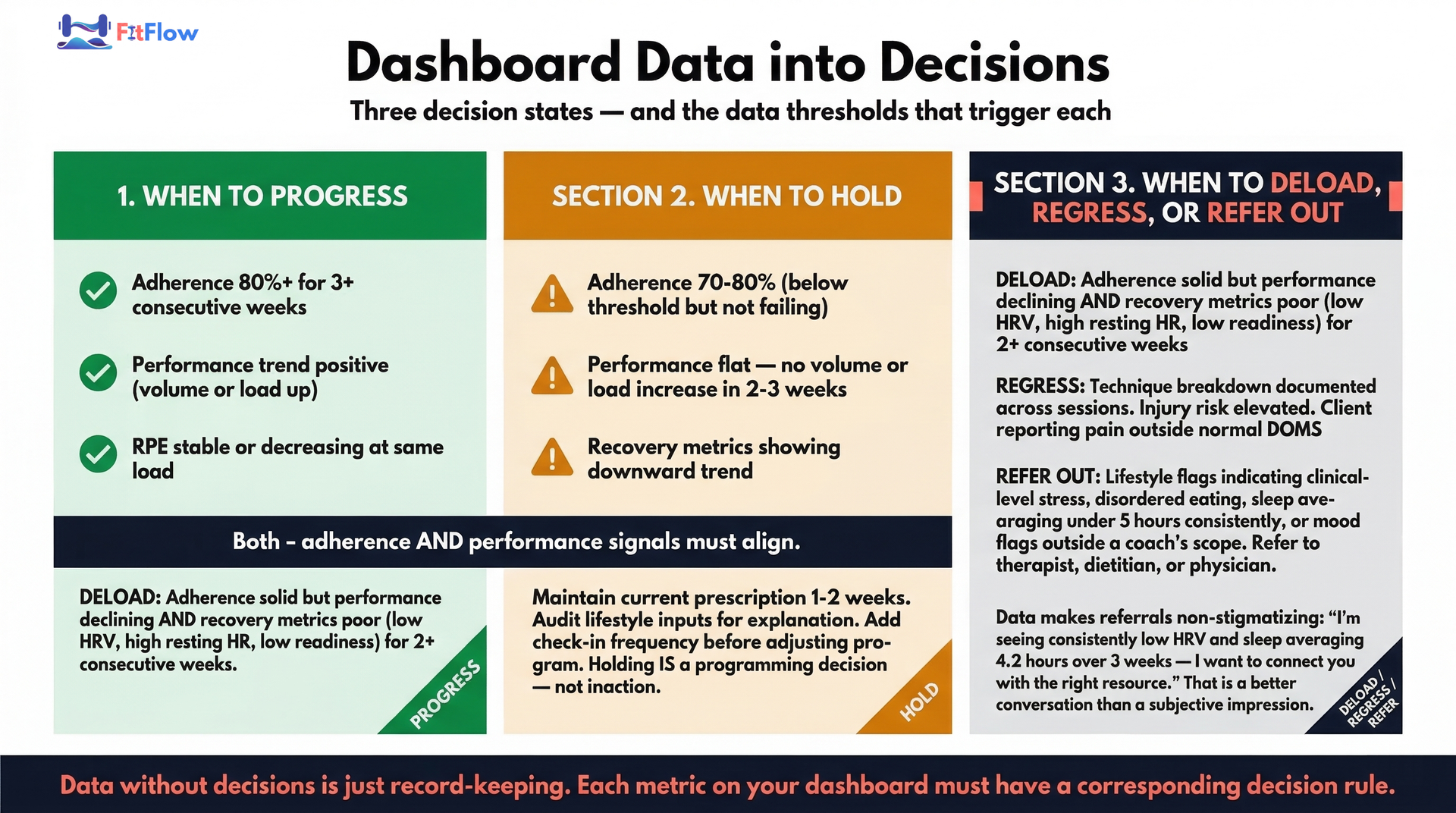 Build decision rules, not just dashboards. Every metric should have a threshold that triggers a specific coaching action: progress, hold, deload, or refer.