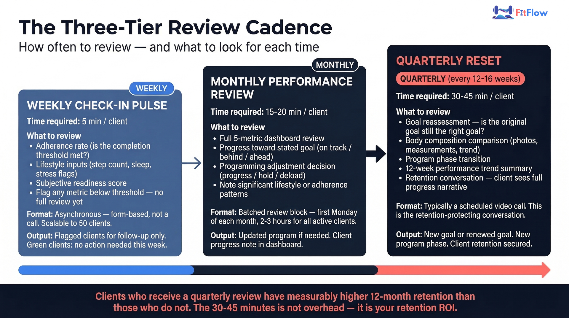 How often should trainers review client progress? Trainers should review client progress on three tiers: a weekly asynchronous check-in (5 minutes per client), a monthly full dashboard review (15-20 minutes per client), and a quarterly reset conversation (30-45 minutes per client). This tiered approach balances thoroughness with scalability.