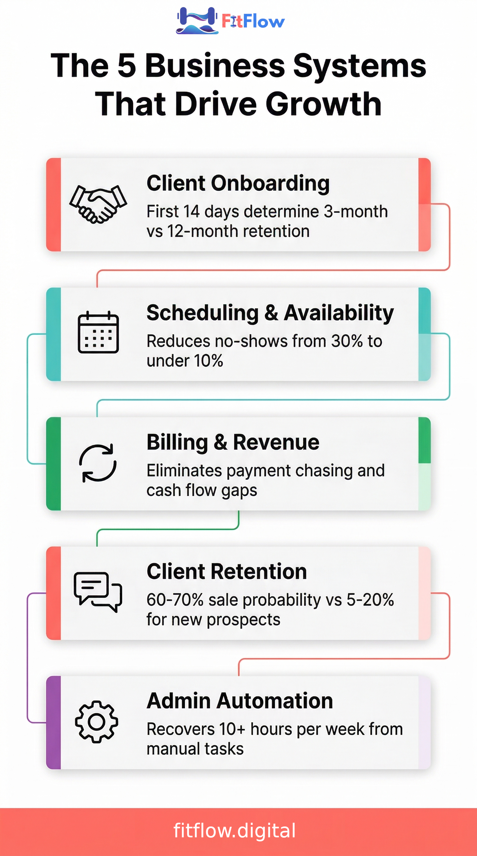 The 5 business systems that drive growth: Client Onboarding, Scheduling and Availability, Billing and Revenue, Client Retention and Communication, and Admin Automation.
