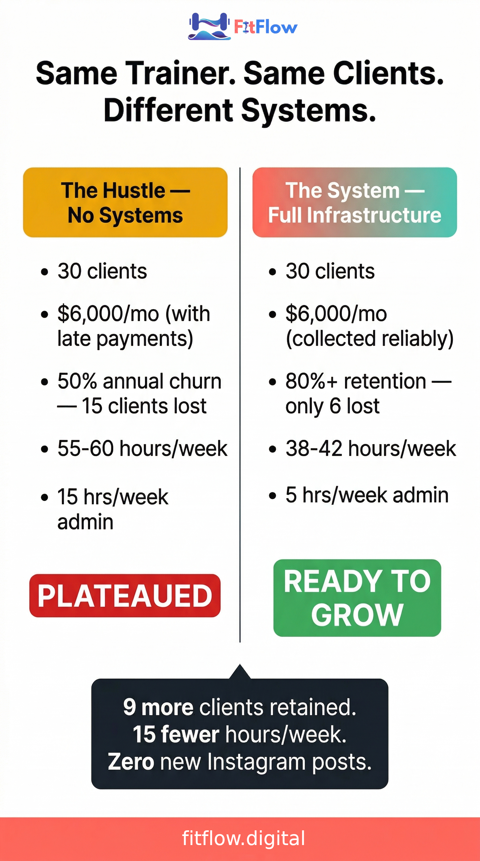 Same skills, different systems = different outcomes. A systematized trainer retains 9 more clients per year, works 15 fewer hours per week, and frees capacity to grow.