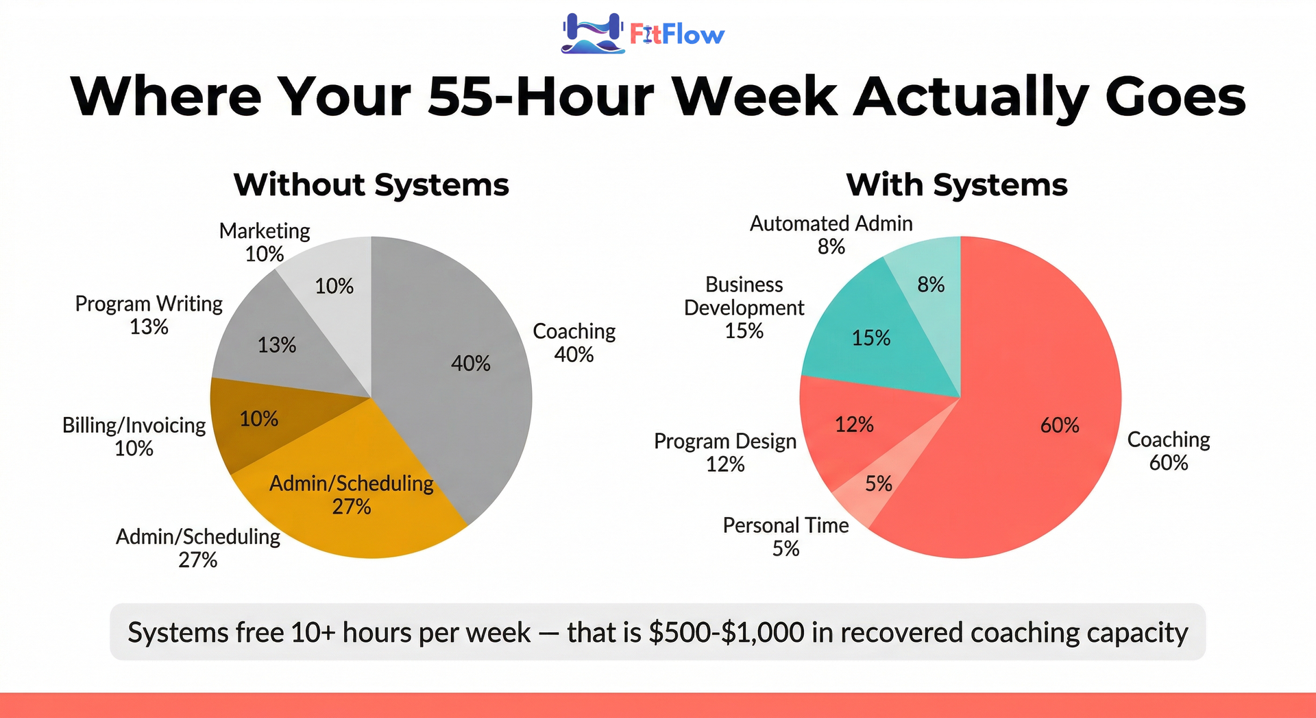 At a coaching rate of $50-$100/hour, those 15 hours represent $750-$1,500/week in forfeited coaching revenue — roughly $39,000-$78,000 per year spent on tasks that generate no direct revenue.