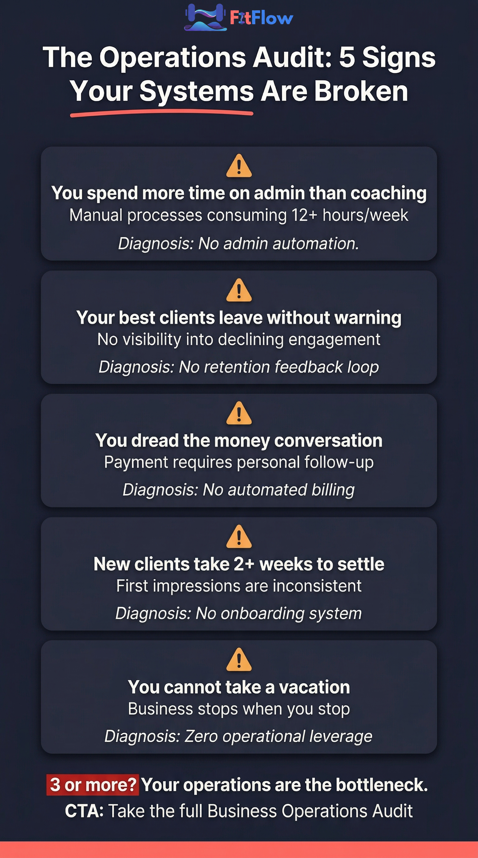 This article is about business systems — the operational infrastructure that manages the client lifecycle from first contact to long-term retention: scheduling, onboarding, billing, retention workflows, and admin automation. This is not about coaching methodology. We previously explored how coaching systems determine client results. This article tackles the other half: the business systems that determine whether your business survives.