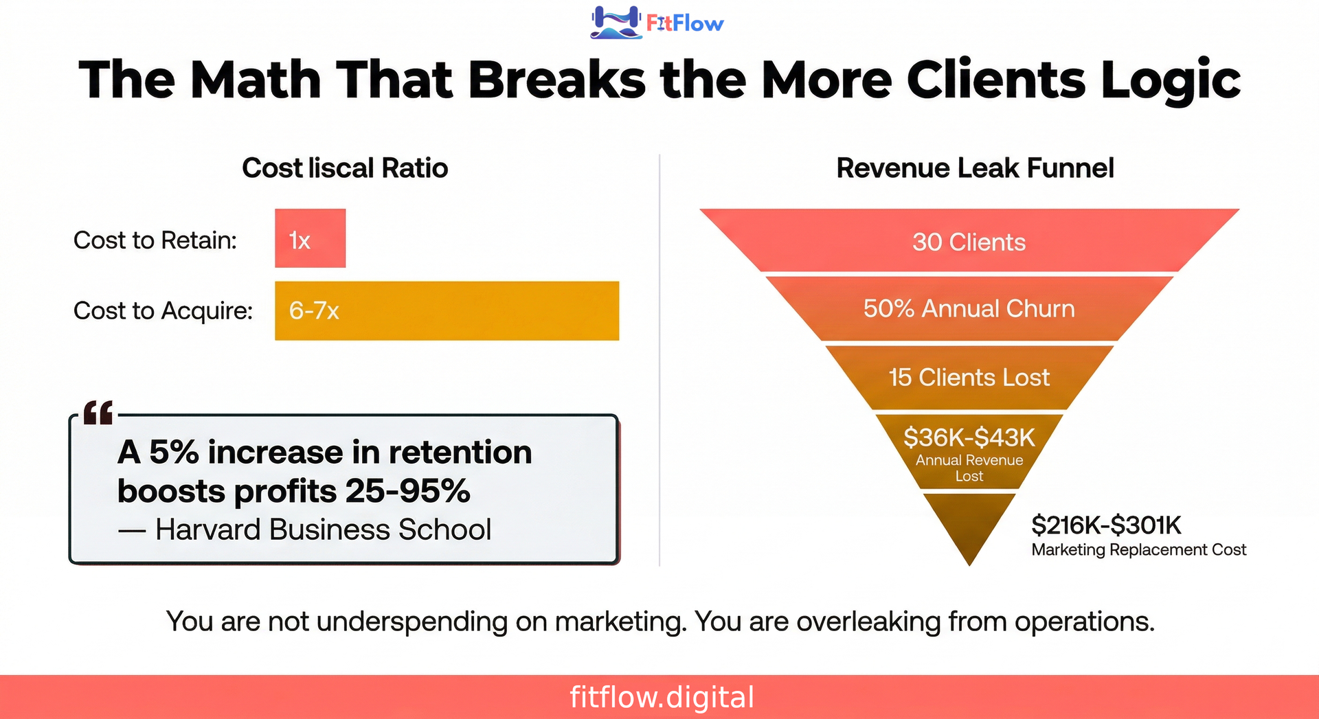 The economics are unambiguous. It costs 6-7x more to acquire a new client than to retain an existing one (Harvard Business School via Arvo, 2026). A 5% increase in client retention can boost profits by 25-95% (TrueCoach, 2026). Yet most trainers spend 80% of their business energy on acquisition and 20% on retention.