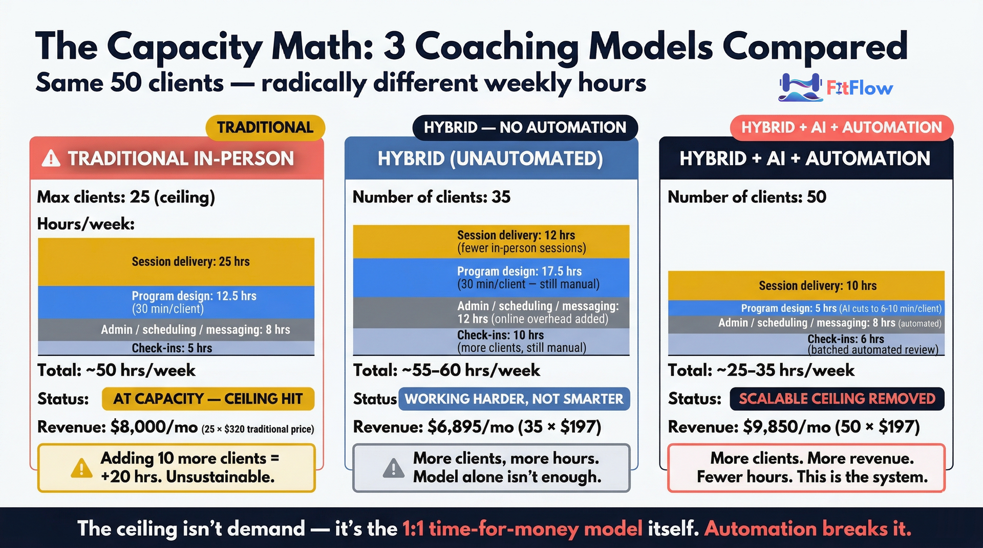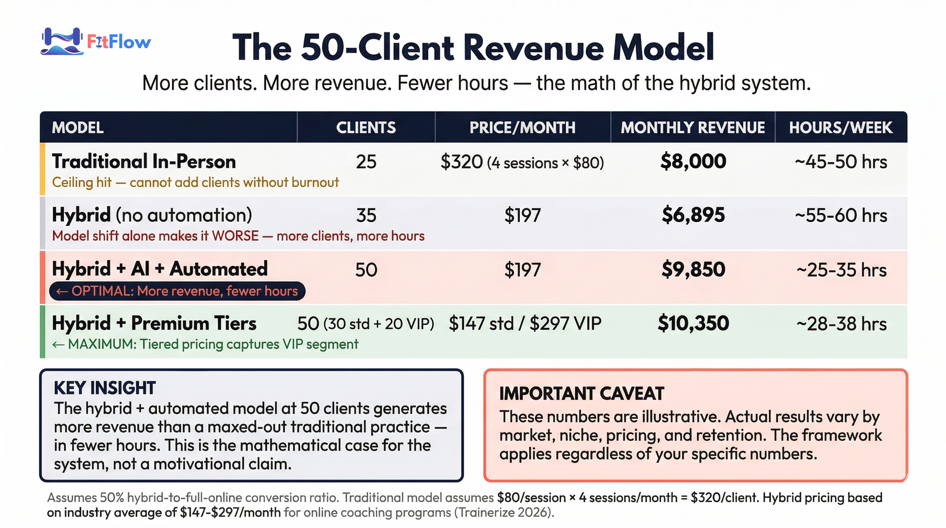 The math works. 50 hybrid clients at $197/month generates $9,850/month in 25–35 hours per week — more revenue and fewer hours than a maxed-out traditional practice.