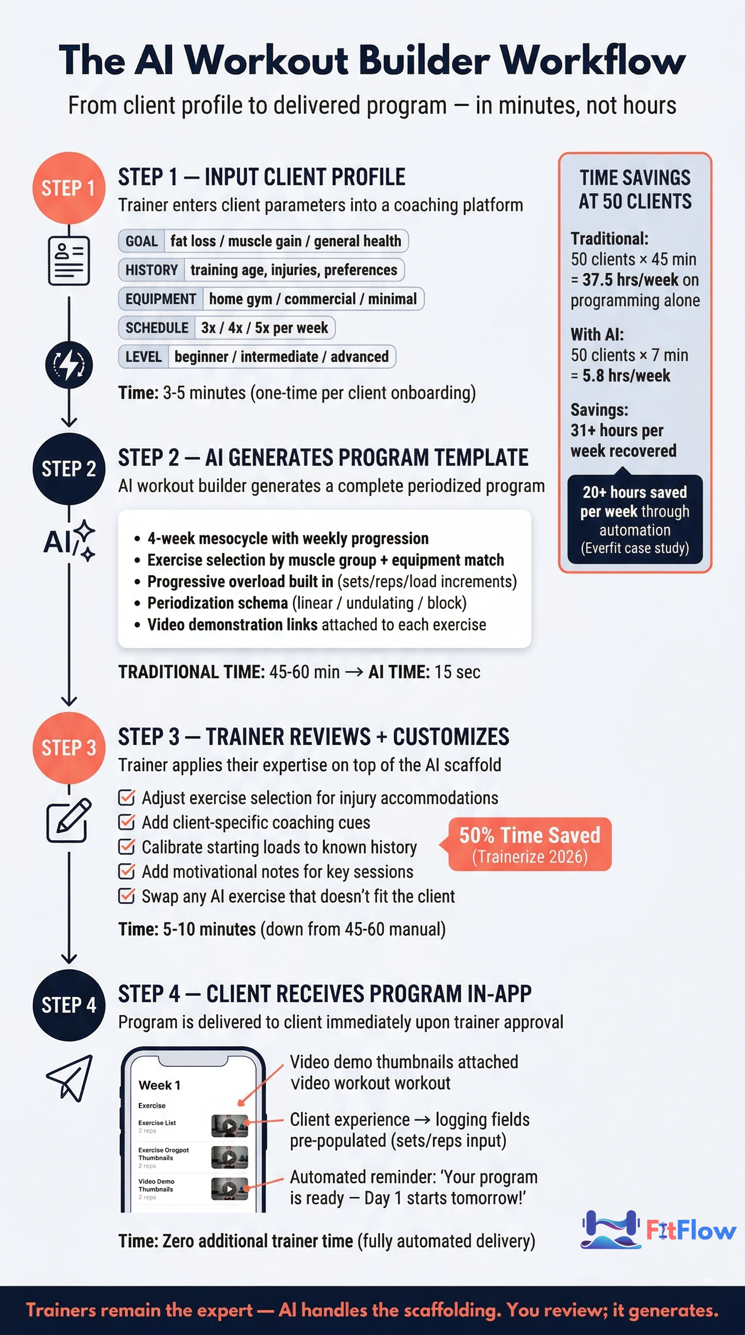 Platforms like FitFlow's AI workout builder generate complete training programs in minutes. That lets trainers spend their time on coaching calls, not spreadsheet grids. The output is a high-quality program built to the individual — not a cookie-cutter template.