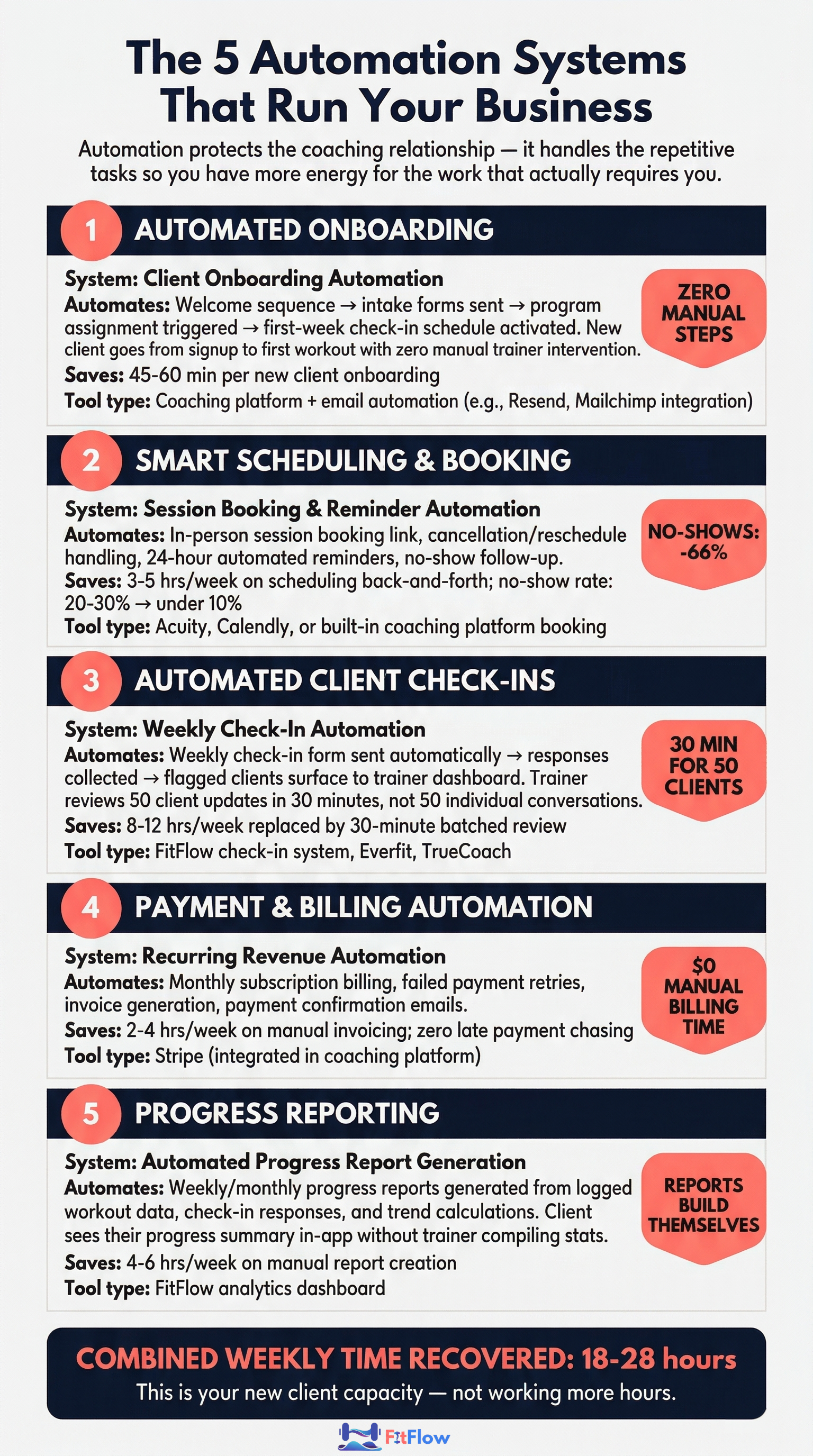 Five automations protect the coaching relationship. Automated onboarding, scheduling, check-ins, billing, and reporting save 15–20 hours of weekly admin.