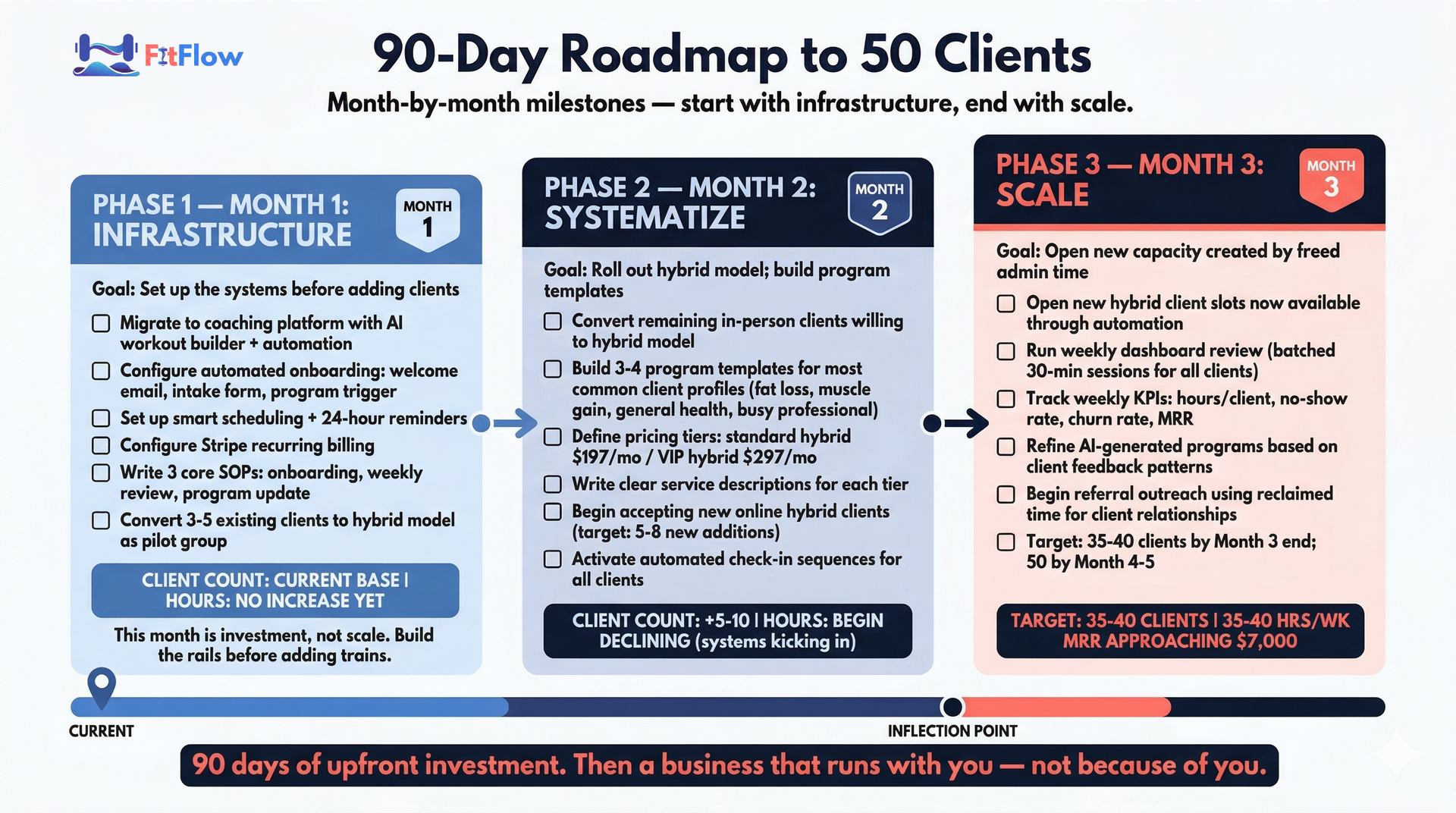 Target: 35–40 clients by end of Month 3, with systems ready to reach 50 by Month 4–5