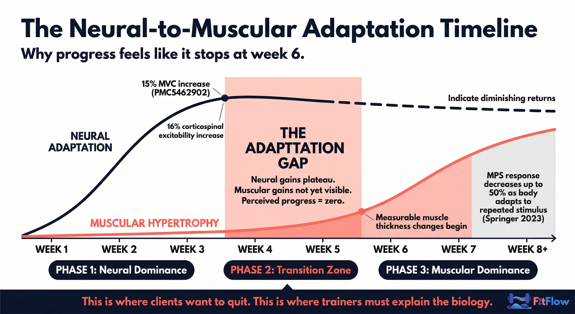 This creates what we call the adaptation gap: a window between the neural ceiling (when nervous system improvements plateau) and the visible muscular response (when structural changes become measurable). During this gap, the client's perception is that progress has stopped. In reality, the mechanism of progress is transitioning from one system to another. The nervous system has done its part. The muscular system has not yet caught up.