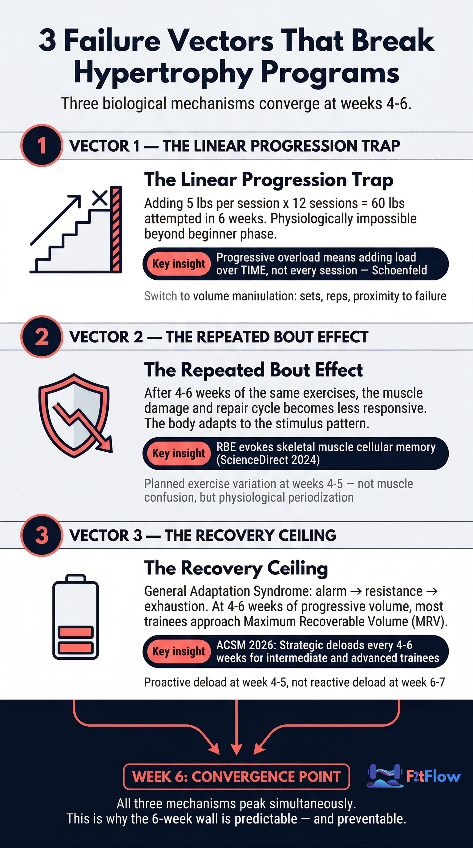 The 6-week hypertrophy plateau is not a programming failure. It is a biological transition — the predictable convergence of three mechanisms: the linear progression trap (load-based overload hitting its mathematical ceiling), the repeated bout effect (diminished stimulus response from exercise familiarity), and the recovery ceiling (cumulative fatigue exceeding recovery capacity).