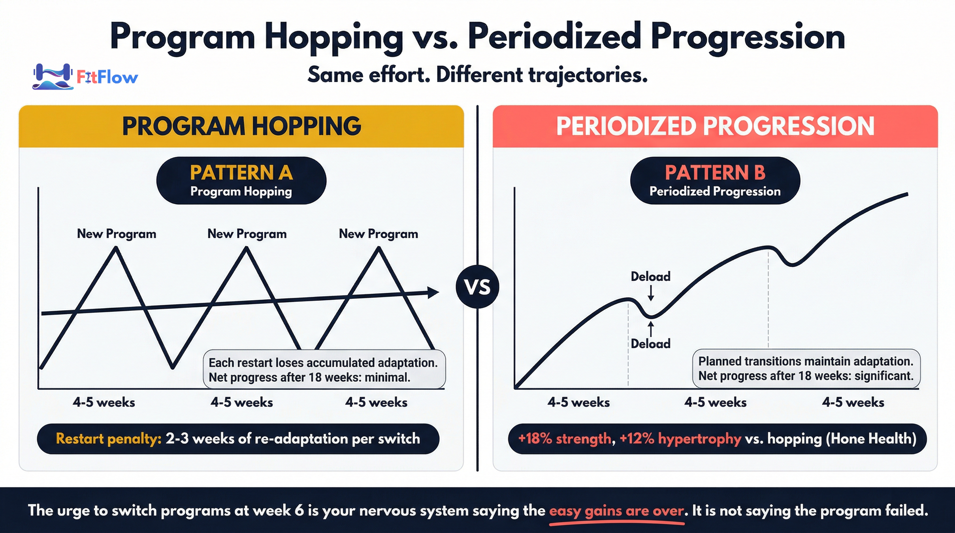 The data supports the case for staying the course — with modifications. Research compiled by Hone Health found that trainees who maintained single-program consistency demonstrated 18% greater strength gains and 12% more hypertrophy compared to those who switched programs every three to four weeks. But the solution is not "just be more disciplined." The solution is understanding the biology and programming around it.