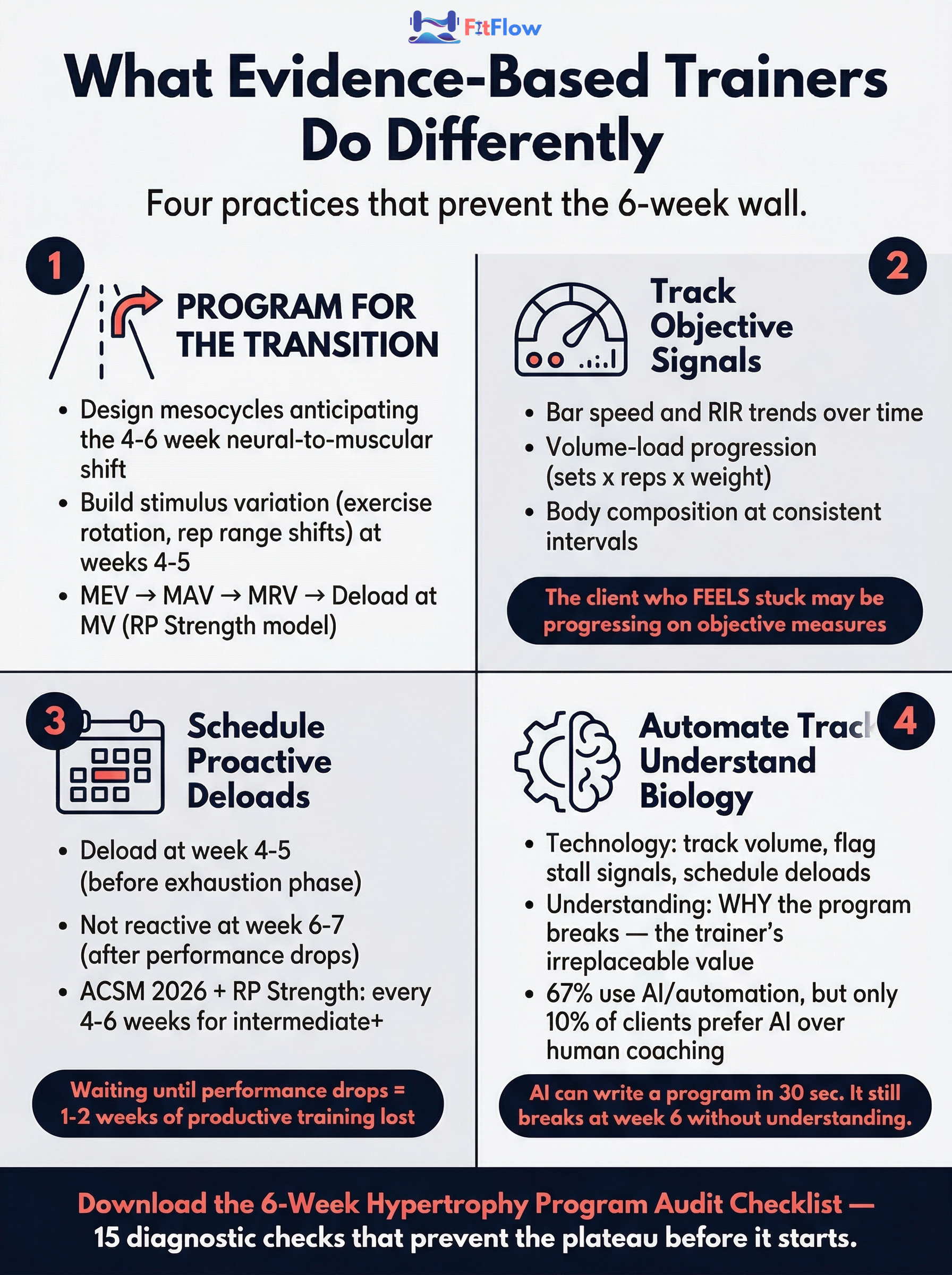 For trainers managing hypertrophy clients: understanding the biology of the 6-week wall is not optional knowledge. It is the difference between a client who stays because you explained what was happening and programmed around it, and a client who program-hops to another trainer because nobody told them the stall was temporary.